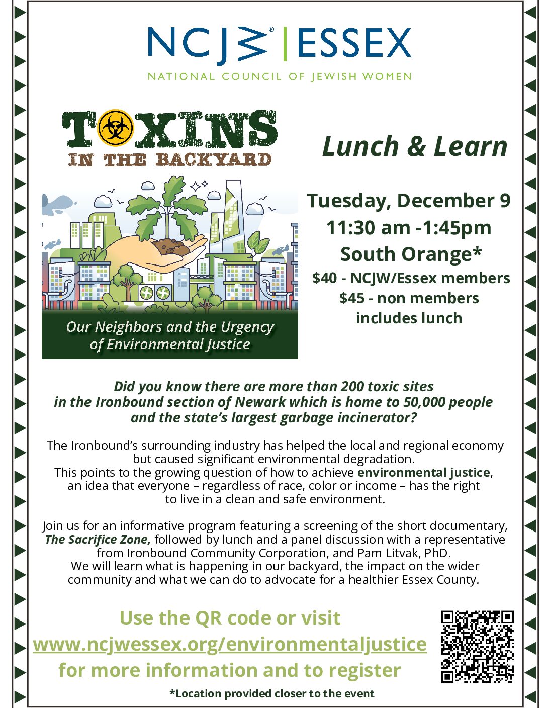 Tuesday, December 9 11:30 am -1:45pm South Orange* $40 - NCJW/Essex members $45 - non members Includes lunch Register (*Location provided closer to the event) Did you know there are more than 200 toxic sites in the Ironbound section of... |