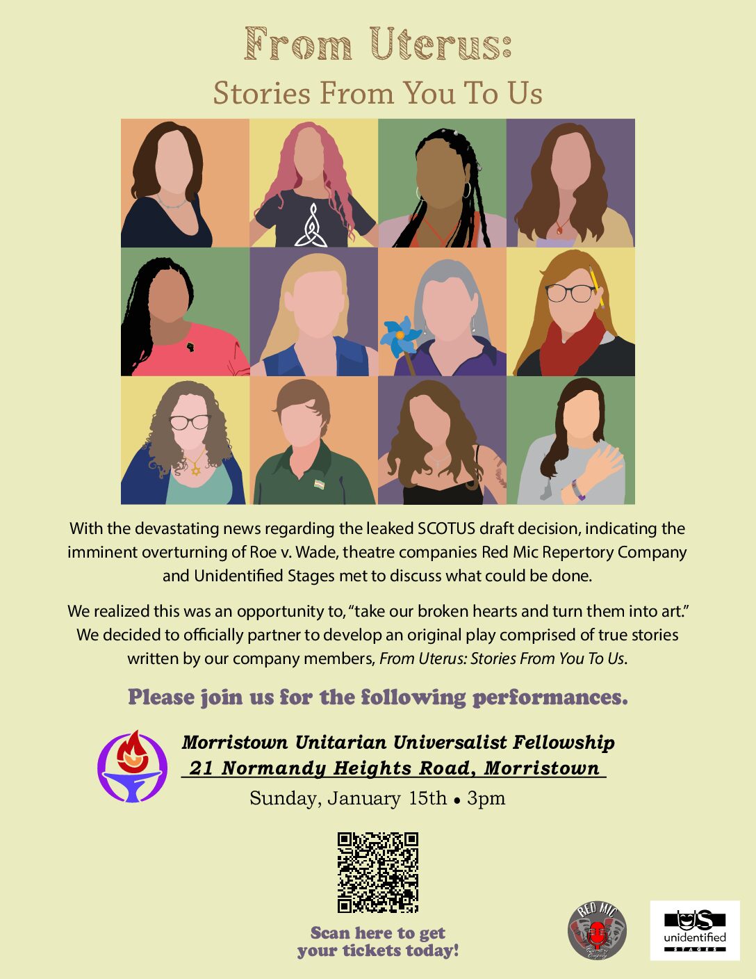 Modeled after The Vagina Monologues, this show has introductory and closing scenes, as well as group scenes based on interviews conducted with the women and uterus owners, and original monologues written and performed by Red Mic Repertory Company and Unidentified...